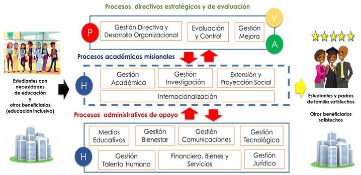 - Se establecen procesos claros y eficientes que permiten una excelente prestación de servicios desde los tres ejes misionales a toda la comunidad universitaria. Igualmente, se brinda información clara y oportuna a los grupos de interés de la Institución.